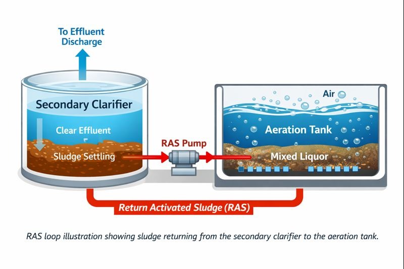 RAS vrací usazený kal do biologické nádrže pro udržení biomasy a kapacity čištění. WAS odstraňuje přebytečný kal pro kontrolu stáří kalu (SRT) a zabraňuje hromadění kalu. Společně RAS a WAS udržují systém aktivovaného kalu stabilní a účinný.